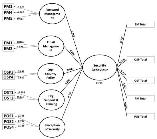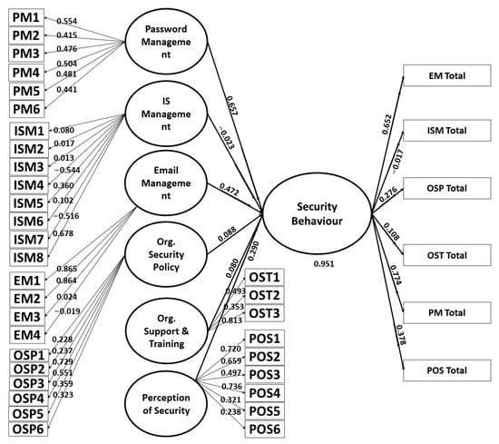 To measure the discriminant validity, we used the Fornell-Lacker criterion, which highlights that the average variance of a construct must be greater than the correlation of the same construct with all other constructs [73]. As shown in Table 3, email management’s AVE value 0.612 is higher than all other values of other constructs in the same column; similarly, the infrastructure management value (0.382), organizational security policy value (0.443), organizational support and training value (0.586), and password mange value (0.480) are higher than the relevant construct values; therefore, discriminant validity is established.