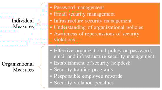 To sustain the security behavior of business employees, a two-pronged strategy is presented in Figure 4, where both employees and businesses are required to work on improving employee security behavior. At the individual level, business employees must follow more strict password security management procedures, as our findings highlighted that, out of six subfactors of the password management construct, only three had a factor rating that was more than 0.6.