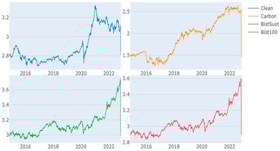 Upon examining the price series graphs of the variables in Figure 1, it is understood that there was a great deal of price variability within the last 2 years. Sudden price decreases were observed in these indexes during the COVID-19 pandemic. With the decline in the impacts of the pandemic, an increase existed in these variables until 2022. Since the beginning of 2022, there has been a significant upward trend in these indexes. Unlike the “Carbon”, “Bist100”, and “BistSust” variables, the “Clean” variable demonstrated fluctuating price movements in 2022.
