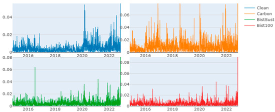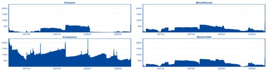 Figure 2 illustrates the volatility series graphs of the variables. The “Carbon” variable has the highest volatility among the variables. Extreme increases in the volatility of all variables are particularly apparent at the beginning of the pandemic and the Russia–Ukraine conflict. However, although the “Carbon” variable has high volatility in all periods, high volatility occurs in the “Clean”, “Bist100”, and “BistSust” variables from the beginning of the COVID-19 pandemic to the end of 2022.