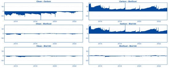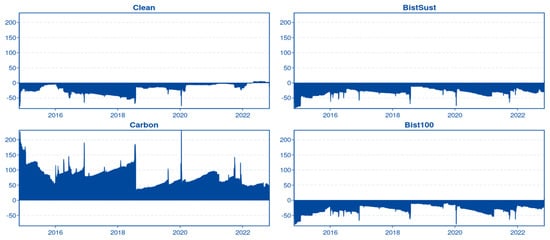 In Figure 4, the shaded areas below zero level indicate the volatility received in the corresponding date or period, whereas shaded areas above zero level indicate volatility spilled over in the corresponding date or period. According to the results, “Clean”, “BistSust”, and “Bist100” are variables that experience volatility. However, the “Clean” variable is the one from which volatility spills over at the end of 2022. The “Carbon” variable, however, spills high volatility over in all periods. At the beginning of the COVID-19 pandemic, the “Carbon” variable spills the highest volatility, whereas “Clean”, “BistSust”, and “Bist100” variables experience the highest volatility during the same period.