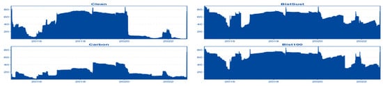 S&P GCEI is designed to measure the performance of enterprises in both emerging and developed markets, with a goaled constituent count of 100. EUA is designed to measure the performance of the EUA market (https://www.spglobal.com/ (accessed on 10 January 2023)). BIST sustainability index is an index of companies whose shares are traded on BIST and whose corporate sustainability performance is high. The BIST 100 index represents the 100 companies with the highest market values. “Clean” and “Carbon” variables used in the study were obtained from www.spglobal.com (accessed on 10 January 2023); whereas Bist100 and BistSust variables were obtained from www.investing.com (accessed on 10 January 2023) webpage. Closing datasets at the daily frequency cover the period of 11 April 2014–11 November 2022 for all variables. The datasets of the variables were converted into return series with the formula ln(Pt/Pt−1) × 100, and then volatility series were obtained by taking the squares of the return series.