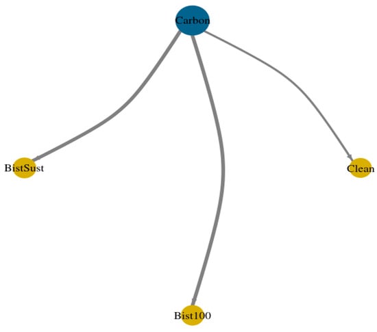 In Figure 8, the VS among the volatility series of the variables used in the study are illustrated in the form of a network graph. The blue circles in the graph illustrate the variable(s) whose volatility spills over to others, whereas the yellow circles illustrate the variables that receive VS. Also, the size of the circles indicates the magnitude of the spillover impact. Accordingly, “Carbon” is the variable whose volatility spills over to others, whereas “BistSust”, “Bist100”, and “Clean” are the variables that receive the VS. In other words, the volatility of the “Carbon” variable spills over to the “BistSust”, “Bist100”, and “Clean” variables. The arrows in the graph indicate the direction of the VS and the thickness of the lines along with the arrows indicates the magnitude of the VS. Accordingly, the volatility of the “Carbon” variable spills over more to the “BistSust” and “Bist100” variables than to the “Clean” variable.