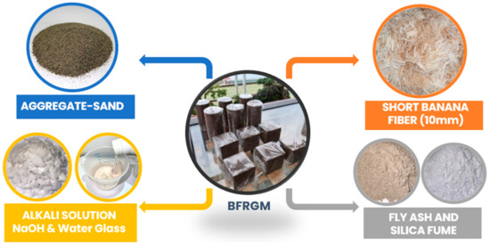 Figure 1 shows the composition of BFRGM. Banana fibers (BF) from pseudo stems with 10mm length were used as reinforcement of the BFRGM. The treatment process used 4% of NaOH mixed with 96% of water, to form the solution wherein a 1:30 liquor ratio was utilized [13]. This ratio was used to fully submerged all the BFs on the solution.