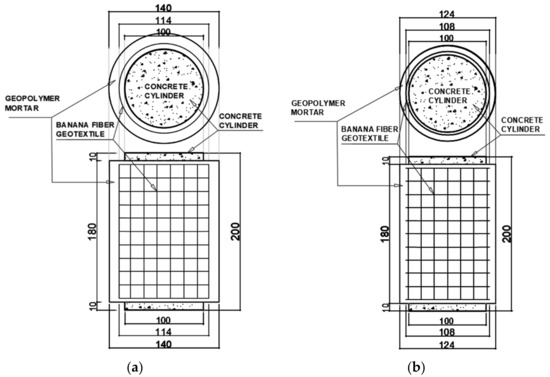 Banana Geotextile-Reinforced Geopolymer Mortar (BGT-RGM) Confinement Scheme: (a) scheme for 20 mm thick BGT-RGM, (b) scheme for 12 mm thick BGT-RGM.