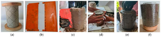Banana Geotextile-Reinforced Geopolymer Mortar (BGT-RGM) (a) concrete cylinder with roughened surface; (b) PVC molding guides; (c) application of the 1st layer of the BGT-RGM, (d) placing of the BGT as 2nd layer of BGT-RGM; (e) application of the final layer of the BGT-RGM; (f) plastic cling wrap on the BGT-RGM confined concrete.