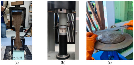 Testing of BFRGM: (a) dog-bone tensile test, (b) compressive strength test, (c) flowability test.
