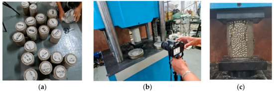 Testing of BGT-RGM confined concrete: (a) BGT-RGM confined concrete samples, (b) control sample compressive strength test, (c) BGT-RGM confined concrete compressive strength test.