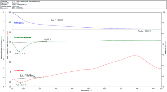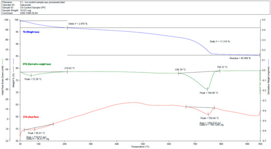 To determine the chemical phenomena happening during each process of degradation, a selected representative sample was tested from various types of materials. TGA was used to monitor sample mass with respect to temperature and time [36]. The Thermogravimetric—Differential Thermogravimetric (TG-DTG) and Differential Thermal Analysis (DTA) curves of the samples were provided from the analysis. The same parameters and treatment for OPC mortars were used when analyzing the BFRGM, wherein evident weight losses and corresponding peak temperatures in the TG-DTG curves and DTA peak temperatures were presented, to differentiate the traditional OPC mortar and the innovative BFRGM.