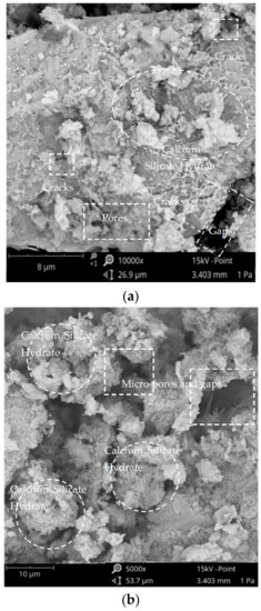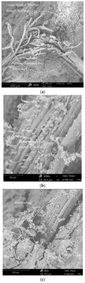 The images in Figure 14 are of the BFRGM sample that has the highest average compressive strength of 25.46 MPa. The banana fibers used in this sample were treated with 4% NaOH by mass for 4 h, which resulted in an enhanced appearance and roughness of the fiber, creating a better fiber-matrix interlock. The addition of banana fibers to the BFRGM matrix could improve strength, reduce cracks and shear stresses, and improve the bond between the fiber and the matrix [42]. The extent of cracks in the composite depends on various factors, such as the bond between the textile and the mortar, the strength of the fibers, and the quality of the textiles used, as noted by De Felice et al. [43]. SEM images captured in this study revealed pores and cracks in the matrix, debonding of fibers and matrix, rough surfaces between the geopolymer mortar and fiber, and some SiO2 particles. These observations are consistent with previous studies, such as those conducted by Camargo et al. [12] and Naghizadeh et al. [44], which have shown that a modified abaca fiber with a rougher surface and uniformity can lead to improved compressive and flexural strength of the matrix. The findings of Riahi et al. [45] and Snellings et al. [46], on debonding and SiO2 particles, respectively, were also confirmed in this study.