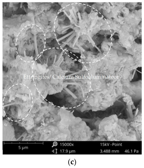 Scanning Electron Microscopy (SEM) for Type S OPC mortar: (a) 8 µm OPC mortar SEM image, (b) 10 µm OPC mortar SEM image, (c) 5 µm OPC mortar SEM image.