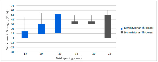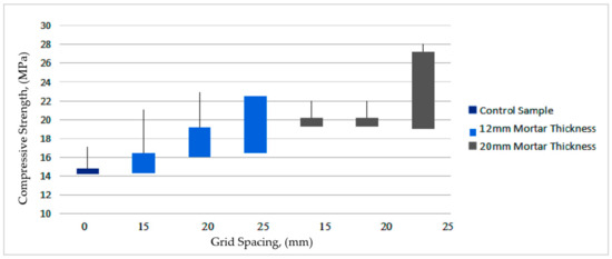These results from Figure 15 and Figure 16 highlight that the BGT-RGMs with 20 mm thick mortar have higher compressive strength values compared to the BGT-RGMs with 12 mm thick mortar, while 15 mm and 20 mm grid spacing of BGTs gave higher compressive strength that 25 mm grid spacing of BGTs. This is due to the 15 mm and 20 mm yarn spacings allowing the short BFs to penetrate between the BGTs grid spaces. The 20 mm thick BFRGM reveals greater compressive strength, through the application of BFRGM layers in between BGTs that impregnate and bind the matrix.