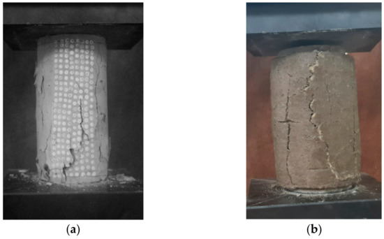 Figure 19 illustrates the cracked samples after the compression test using a universal testing machine. Figure 19a depicts cracks induced by unconfined concrete samples after the compression test, and Figure 19b depicts cracks initiated at the BGT-RGM confinement until it fails.