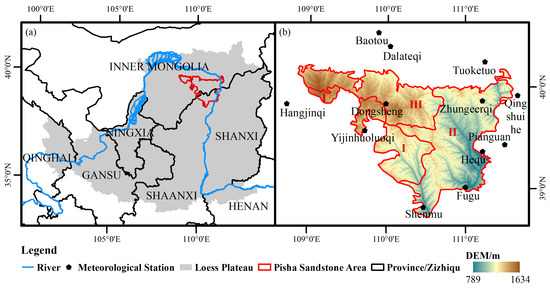 Geographical location of the Pisha sandstone area at different scales: (a) within the Loess Plateau; (b) inset showing the Pisha sandstone area (I = sand-covered; II = soil-covered; III = bare sandstone).