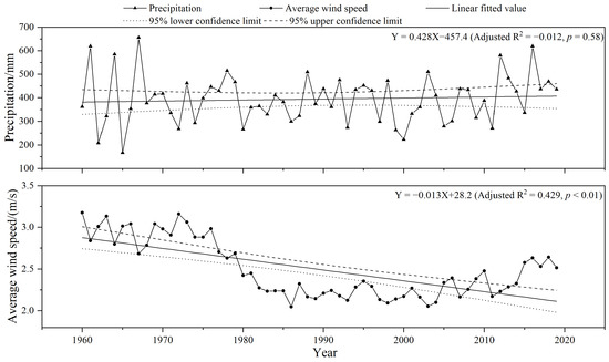 Trend regression test of annual precipitation and average wind speed.