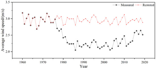 The annual average wind speed from 1960 to 2019 was divided into five subsequences according to the detected change points, and then the mean, Cv, and slope of the linear regression were used to compare the differences in the subsequences (Table 3). The results showed weakly variable, non-significant decreases (p > 0.05) in the subseries, so the mean change was considered to be the main internal difference between the subseries. In order to keep the sequence consistent, the annual average wind speed was restored according to the mean difference in the subsequences (Figure 4). Subsequently, trend and change point tests were carried out on the modified series, and the test results failed to pass the significance test of 0.05 reliability, indicating that the series modified by the reduction method met the requirements of stationarity.