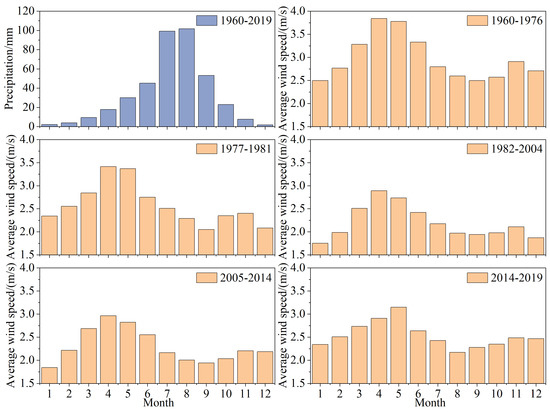The intra-annual distribution of precipitation in the Pisha sandstone area from 1960 to 2019 (Figure 5) shows that the regional precipitation is composed of a single-peaked distribution, with June to September as the main peak, accounting for 75.8% of the annual precipitation. According to the detected change points, the intra-annual distribution of the average wind speed in the Pisha sandstone area from 1960 to 2019 was divided into five subsequences. In comparison, we found that the order of the monthly average wind speed in each period was consistent with the annual average wind speed, with March to June as the main peak. The variation coefficients of the monthly precipitation and average wind speed were calculated, and the monthly precipitation showed strong variation with a coefficient of variation of 1.08, while the average wind speed showed moderate variation with a coefficient of variation range of 0.11–0.17.
