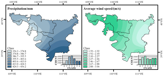 The multi-year average annual precipitation and average wind speed values of 12 meteorological stations in and around the study area were calculated, and the spatial distribution maps of the monitoring values (Figure 6) were obtained by kriging interpolation. At the spatial scale, the multi-year average annual precipitation in the basin ranged from 356.3 to 436.2 mm, with an obvious distribution feature of decreasing from southeast to northwest. Meanwhile, the multi-year average annual average wind speed in the basin ranged from 1.59 to 3.06 m/s, with an obvious distribution feature of increasing from southeast to northwest. The spatial distribution of the multi-year average annual precipitation and average wind speed were divided into seven classes by the natural breaks, and the distribution of the data in each class was counted (Figure 6). The results show that the spatial distribution of the multi-year average annual precipitation was more uneven than that of the multi-year average annual average wind speed, and the variation coefficients of the multi-year average annual precipitation and average wind speed were 0.55 and 0.19, respectively. The main distribution interval of the multi-year average annual precipitation was 395.5–403.6 mm, and that of the multi-year average annual average wind speed was 2.10–2.27 m/s.