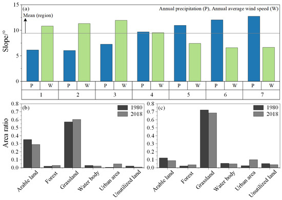 Discussion on risk considering the spatial differentiation of external erosion forces: (a) slope mean in external erosion force classes; (b) land use change in annual precipitation class 7; (c) land use change in annual average wind speed class 7.