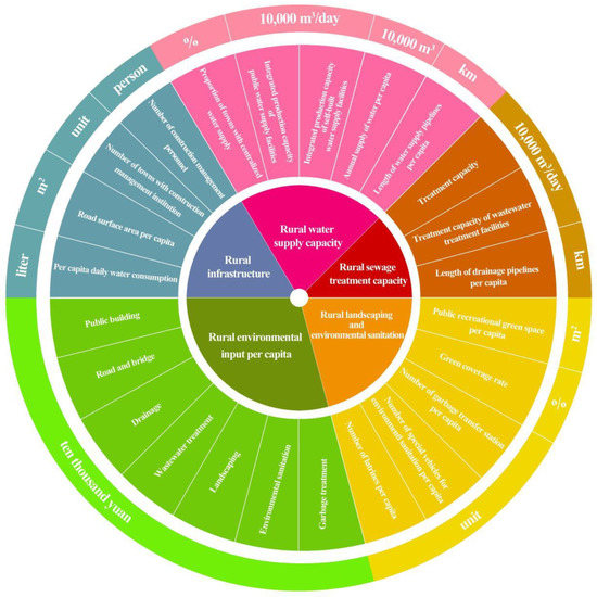 Rural water supply capacity. High-quality drinking water and good ecological quality are inseparable [36]. The sustainable use of water resources is a strategic issue for China’s economic and social development, the core of which is to improve water efficiency. The water supply issue for urban and rural residents is directly related to residents’ lives and environmental protection [37]. Using the Delphi method, scholars have selected rural economic, population, and environmental indicators to evaluate rural development in Portugal. The ecological indicators include the proportion of treated wastewater and bodies of water with good ambient water quality [38]. Water supply capacity can guarantee water security for human habitation and ecological balance in extreme climates. For this reason, this paper includes five indicators of rural water supply capacity, which are the proportion of towns with centralized water supply, the integrated production capacity of public water supply facilities, the integrated production capacity of self-built water supply facilities, the annual supply of water per capita, length of water supply pipelines per capita.