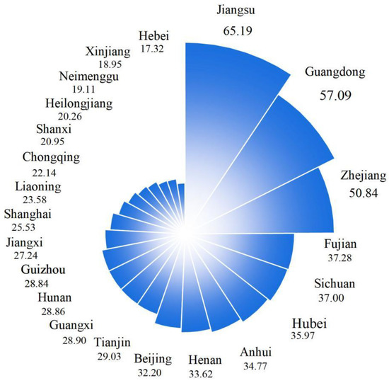 - The average value of the Ecoregion Index for the 22 rural provinces in China ranged from 17.32 to 65.17. The index is higher in the southeastern coastal region, with the highest values in Jiangsu, Guangdong, Zhejiang, and Fujian provinces.