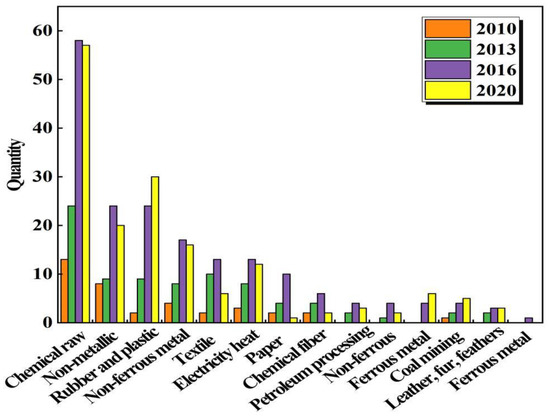 Figure 3 shows the changing industry distribution of green M&A listed companies from 2010–2020. Overall, the number of listed green M&A companies grew faster between 2010 and 2016, with most industries showing an upward trend in the number of green M&A between these years. Among them, the raw chemical, non-metallic, rubber, and plastic industries have a high number of M&A, with 24, 9, and 9 in 2013, and 58, 24, and 24 in 2016. Such a sharp rise in the quantity increases in 2016 relative to 2013 mainly because of the green development plan implemented by China in 2012. The government’s strict environmental protection policies promote increased green mergers and acquisitions. The governments of different regions implemented low-carbon economic strategies to establish and form a government-led carbon emissions trading market and explore the establishment of market mechanisms to promote energy conservation and emission reduction and control greenhouse gas emissions as an effective strategy to achieve low-carbon economic development. The governments established pollutant emission standards for nine highly polluting industries, including raw chemicals, non-metallic, non-ferrous metals, textile, and building materials.