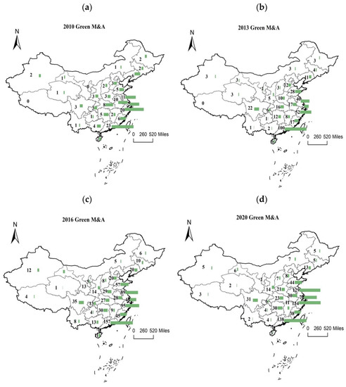 Figure 4a shows the regional distribution of green M&A in 2010, and we can see the trend in the graph. Compared to the provinces in western China, the number of M&A is higher in the provinces in eastern China, especially in the eastern coastal region. Examples include Guangzhou, Shanghai, Fujian, and Jiangsu provinces, which are located in the southern part of the coastal region. Guangdong Province, in particular, ranks first in the number of green M&A with 23. Guangdong Province was the first province in China to implement reform and opening up. The market economy in this province started to develop earlier and has a higher degree of marketization. Compared to other provinces, companies in Guangzhou Province have higher capital strength and the comprehensive ability to carry out green transformation and upgrade the comprehensive governance of enterprises. Compared to Guangdong Province, China’s central and western regions have fewer or no green M&A companies. For example, Henan Province is located in the central region of China, and the number of green M&A listed companies in this province was 3 in 2010, much lower than Guangzhou Province and other eastern provinces. The central region’s economic development level was slower than the eastern region. Environmental protection awareness among managers of heavily polluting companies is low. The government does not have strict environmental protection policies to restrain listed companies, so the number of green M&A companies is low.