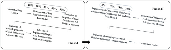 - Dosage of superplasticizer should be limited to 2% to ensure the designed slump value, i.e., 100 mm, after the successful maximum partial replacement of fine aggregates with CBA in combination with Alccofine. To correct this parameter, slump tests were rigorously carried out to analyze the variations in dosage of superplasticizer for CBA concrete mixtures and Alccofine-assisted CBA concrete mixtures. The required dosage of superplasticizer to achieve a slump value of 100 mm is tabulated in Table 4. The detailed research program for Phases I and II can be established in Figure 4.