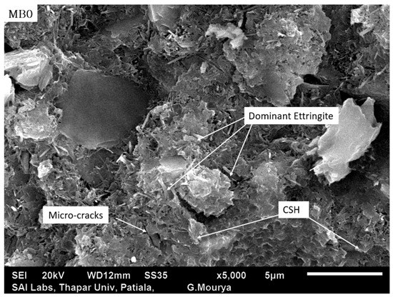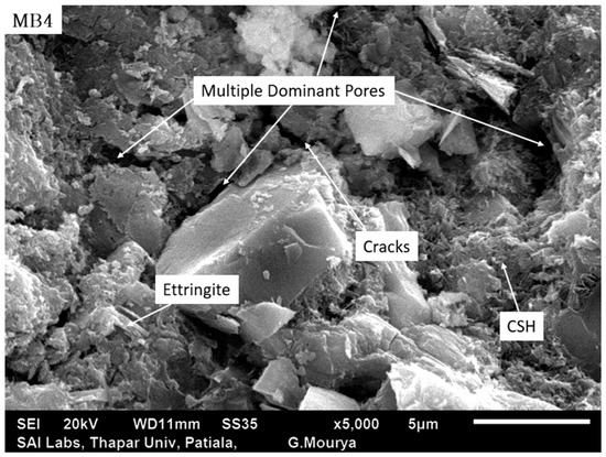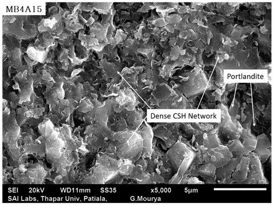 - SEM analysis has depicted the formation of extra C-S-H, due to the excellent pozzolanic reactions, projected dense pore structure and ultimately higher strength gain at all ages for the MB4A15 mix;