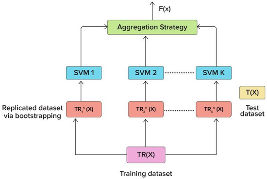 As a result, researchers cannot ensure that a single SVM will consistently deliver the best overall classification efficiency across all test samples. We proposed an ensemble of SVMs to solve this restriction. A similar assumption, which applies to a broad ensemble of classifiers, can likewise apply to the SVM ensemble. The general design of the suggested SVM ensemble is depicted in Figure 2. Using a bootstrap strategy, every SVM is trained individually using duplicated training. Various combination procedures were used to combine the constituent SVMs. All SVMs were synchronously fed with testing samples during the testing step and, depending on the aggregate approach, a collective decision was derived. Regarding multi-class classification, the benefit of employing an SVM ensemble above a single SVM is that it can be achieved with equal effectiveness. As SVMs were designed to perform two-class classifications, numerous SVMs must merge to acquire the multinomial categorization described in Section 2.2. For multinomial categorization, the SVM classifier does not function as well as it does for binary-class classification. Additionally, we could enhance performance classification in multinomial categorization through an ensemble SVM for which every SVM is structured to perform multinomial categorization [26].