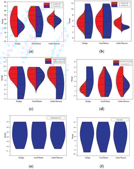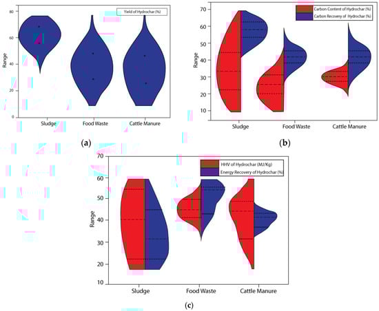 Figure 3 depicts a descriptive statistical analysis for data on food scraps, wastewater slurry, and livestock compost qualities. According to the average of the statistics concerned with elemental exploration, food scraps demonstrated the highest C, H, and O contents and the lowest N content. The basic composition of the sediment had the reverse trend, shown in Figure 3a,b. In proximate analysis, the average moisture content of wastewater slurry and scraps was nearly 90 percent, whereas cattle manure had a water content of approximately 70 percent. Additionally, food scraps were the most volatile, and fc demonstrated a five percent ash concentration, which is much less than compared to the thirty percent for slurry and eighteen percent for livestock compost. The highest ash content in sewage sludge was caused by both the supply of the sewage and the filtration process. The most typical temperature for HTC circumstances was 200–250 °C, and the time was between 60 and 90 min, Figure 3c–f. Regarding output goals, the average HC of slurry capitulated was the greatest at sixty-five percent, resulting in the lowest carbon content and HHV. The median carbon and energy recovered from three types of wastes and converted into HC were, on the other hand, relatively close. Furthermore, the plot of O/C versus H/C suggests that three types of chemical processes (dehydration, demethylation, and decarboxylation) occurred during the process of performing HTC in waste with a high moisture content. The violin plot statistical data of yield, C Char, CR, energy recovery (ER), and HHV is shown in Figure 4a–c.
