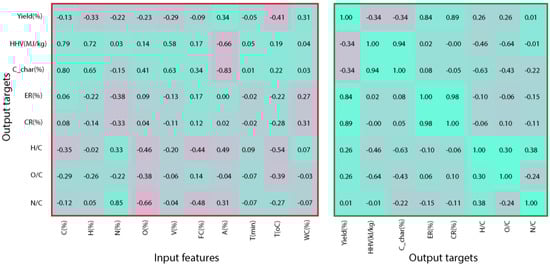 The PCC method was employed for exploring features–targets and targets–targets (248 types of data was analyzed for C_char, T, A, t, CR, Fc, WC, V, ER, and HHV).