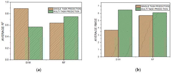 The remaining one-tenth of the testing dataset was compared to the three best models to determine the overall predictive performance for the multi-task HC property prediction. Furthermore, one-task learning was built and evaluated with multi-task training, utilizing identical hyperparameters from each model. The evaluation criteria for model prediction accuracy were established as R2 and RMSE. If the RMSE value was low or the R2 value was closer to 1.0, then the prediction accuracy would be high. For diagnosing ER, C char, H/C, and CR, the R2 multi-task of RF was higher than the single-task R2, as can be seen in Figure 5, but the latter remained significantly greater with respect to predicting targets. The RF models, on the other hand, performed poorly (Figure 6a). Although the efficiency for predicting a single task with an RF might be enhanced by setting hyperparameters for every function individually, it is laborious and costly to implement. All the R2 values of the multi-task prediction of the optimized Ensemble SVM algorithm were over 0.85. In addition, the mean R2 was 0.90, which is much greater than compared to the R2 for predicting a task. With multi-task prediction, both the SVM and RF models achieved a minimum average RMSE (Figure 6b). When comparing the suggested model to the existing model shown in Table 2, Ensemble SVM ranked among the top because it had the lowest RMSE and the highest R2.