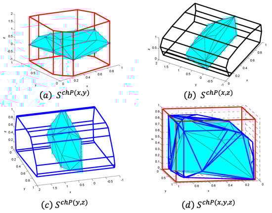 The idea of the PWCH uncertainty set is that the points in the D-dimensional Euclidean space are projected to different two-dimensional (2D) planes, which will yield = D(D − 1)/2 axial PWCHs. Then, the intersection of all PWCHs can be used as the outer approximation of the original convex hull, as shown in Figure 2 (D = 3), where the intersection of the red, black and blue PWCHs can be used as the outer approximation of the original convex hull. Specifically, after projecting to the 2D plane corresponding to the mth and the nth dimension (1 ≤ m < n ≤ D), a 2D convex hull can be constructed for the set of points in the 2D plane, and the range of all dimensions except m and n is relaxed to (−∞, +∞), denoted as