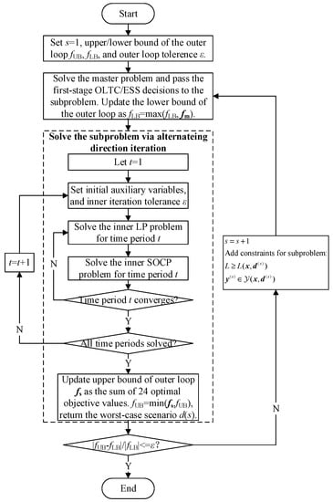 If all 24 time periods are completed (i.e., the subproblem is completed), the upper bound of the outer loop is updated as the sum of the 24 problems’ optimal objective values, and the worst-case scenario solved by the subproblem is passed to the master problem for the next outer iteration. The overall flowchart of the improved CCG algorithm is shown in Figure 3.