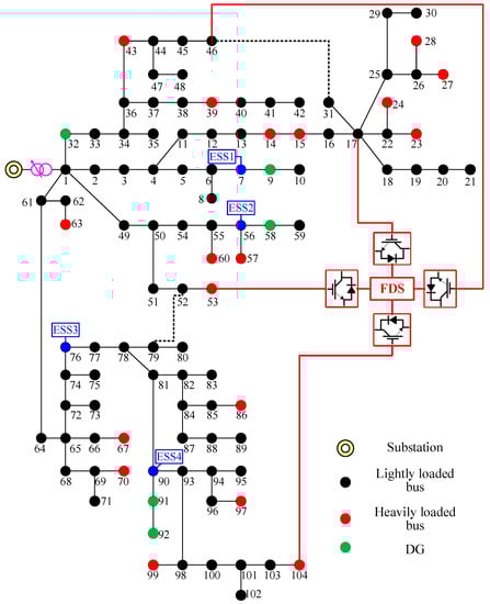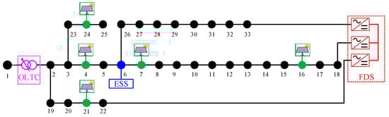 where Pi,t,FDS and Qi,t,FDS are the real and reactive power injections of the FDS into bus i during time period t, respectively; Aloss,FDS is the FDS loss factor; Qmin,FDS and Qmax,FDS are the upper and lower limits of the reactive power through each FDS, respectively; and Smax,FDS is the maximum apparent power allowed through the FDS. Equation (3) makes the sum of the real power injection into all associated feeders by the FDS and the power loss of the FDS come out to zero. Equation (4) makes the reactive power injection of the FDS not exceed its adjustable reactive power limit. Equation (5) makes the apparent power of the FDS not exceed its capacity.