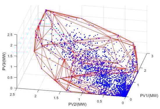 Assume that D buses in the distribution network are installed with DG, and N historical data points (scenarios) are recorded in history for each DG bus. The ith scenario can be represented as a D-dimensional column vector ui = [ui,1, ui,2, …, ui,D]T∈ℝD, i.e., a point in the D-dimensional Euclidean space. Then, the N historical scenarios can be represented as a high-dimensional point set Ωu = {u1, u2, …, uN}, consisting of N points in the D-dimensional Euclidean space. A high-dimensional convex hull enclosing all the points can be constructed as: