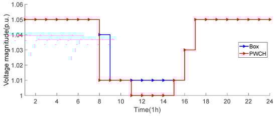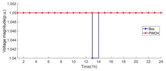 The bus voltage levels at each time period under the two scheduling methods are shown in Figure 14. It can be seen that the voltages of all buses fall in acceptable ranges using both scheduling methods, although both strategies can find the optimal operation strategy to satisfy the voltage level constraints. However, it is obvious that the voltage profile based on the PWCH uncertainty set is smoother, i.e., it is closer to the rated voltage level of the system.