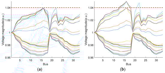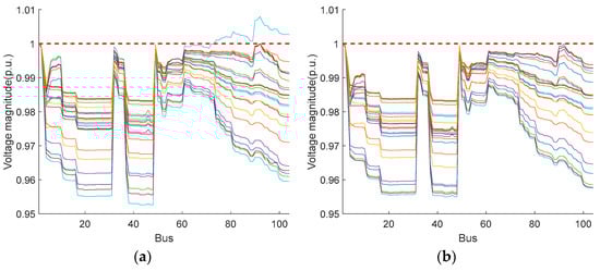 The bus voltage levels at each time period under the two scheduling methods are shown in Figure 9. It can be seen that during all time periods, the voltage level of each bus obtained by the two scheduling methods are within the safe range, thanks to the coordination of the OLTC, ESS and FDS.