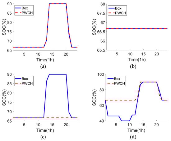 (3) For ESS 4 at bus 90, as this ESS is very close to PVs, the box-based strategy decides to release ESS 4′s energy in advance during time periods 1~10 to prepare for absorbing excessive PV output in time period 13. However, discharging ESS 4 only is not enough to fully prevent any voltage violation risk, thus the OLTC turns down the tap position during time period 13 and cooperates with the upstream ESS 3 at bus 76 to help consume the excessive PV output. On the other side, the PWCH-based strategy neither discharge ESS 4 in advance nor operate the OLTC. The upstream ESS 3 at bus 76 also does not charge/discharge for all time periods. This is because the worst scenario selected from the PWCH uncertainty set is not such harsh as that selected from the box uncertainty set. Therefore, the control strategy is less conservative.