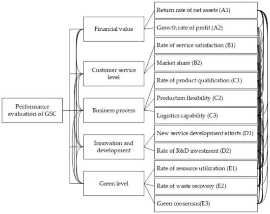 - The rate of service satisfaction (B1) plays an important role in performance evaluations of GSCs. Customers are located at the end of the supply chain and provide objective feedback for the operation effect of the enterprise supply chain. Service satisfaction reflects customers’ recognition of the enterprise and satisfaction with products and services, which is the key factor when measuring customer performance evaluation. It can be seen from Figure 1 that service satisfaction is a result factor that is mainly affected by the green consensus of GSCs.