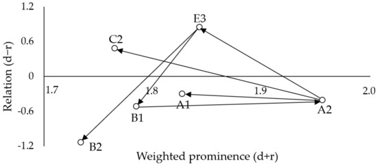 Combining the crisp total influence matrix in Table 11 and the weighted prominence in Table 14, a causal relationship diagram of the six critical indicators was generated, as shown in Figure 4. In Figure 4, we took the relation (d − r) as the vertical axis and the weighted prominence (d + r) as the horizontal axis. We determined the most influential indicator for each critical indicator from the crisp total influence matrix. For example, (E3→B1) indicated that E3 affected B1 the most. As shown in Figure 4, E3 affected B1 and B2 the most. A2 affected A1, C2 and E3 the most. B1 affected A2 the most. Since E3 was the critical driving factor, the improvement of E3 would improve B1, then A2 would be improved by B1, and E3 would be improved by A2, forming a virtuous circle as ‘E3→B1→A2→E3’. The performance of the overall GSC could be improved.