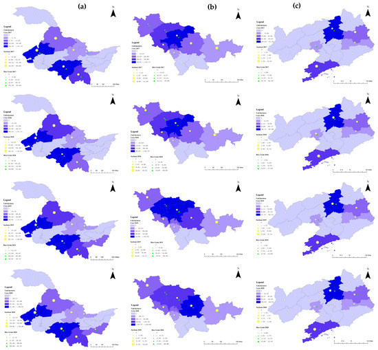 Inter-annual distribution of the main straw crop cultivation area in the three northeastern provinces from 2017 to 2020 ((a) Heilongjiang; (b) Jilin; (c) Liaoning).