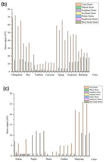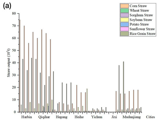 Most of the eastern provinces of China had high summer temperatures, cold winters, and moderate precipitation. Crops were grown once a year; they were mainly well-adapted, sunny, and cold-tolerant crops such as corn and soybeans. The high latitude of Heilongjiang Province had also produced a relative reduction in the area under rice cultivation due to climatic conditions. The state had introduced a series of policy measures to promote agricultural development in order to stabilize the grain market [45], which had promoted an increase of the area planted with straw grain crops in the northeast including a significant increase in the area planted with rice in Shenyang, Liaoning Province. This will effectively ensure the sustainable use of straw.