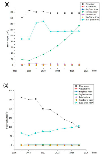 Changes in straw crop planting patterns were a major factor affecting straw yields. Among the three major crops of soybean, corn, and rice, farmers were not very motivated to plant soybean and the planting area was small. The yield of soybean straw was relatively low compared to that of corn and rice straw, and the economic benefit advantage was not obvious. The promotion of structural reforms on the supply side of agriculture had eased the grain backlog faced by farmers, but the low purchase price of soybeans due to imported soybeans had also led to a continued decline in the area planted with soybeans and straw yield in Northeast China [46]. In contrast, corn and rice had high yields, a long-term, stable market demand, stable purchase prices, little fluctuation in planted area, and stable straw yield. Under the influence of the storage policy, there is a substitution of corn for soybean planting, which has a certain impact on soybean straw yield [47]. However, in recent years, the impact of export restrictions imposed by other countries on Chinese soybeans has also promoted the increase in the planting area of Chinese soybeans [48]. However, this has not resulted in a significant increase in planted area due to limited demand.