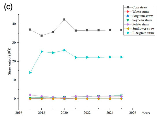 Crop straw yield in Northeast China from 2017 to 2020 ((a) Heilongjiang; (b) Jilin; (c) Liaoning).