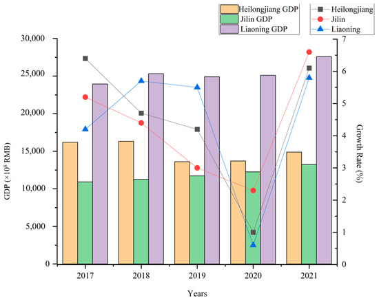 GDP and growth rate of the three northeastern provinces from 2017 to 2021.