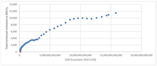 A scatter plot of the relationship between total territorial CO2 emissions and GDP. Sources of data: Global Carbon Atlas [] and World Bank [].