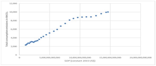 A scatter plot of the relationship between total consumption-based CO2 emissions and GDP. Sources of data: Global Carbon Atlas [] and World Bank [].