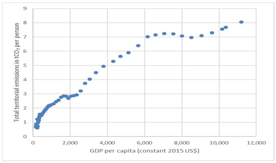 A scatter plot of the relationship between per capita territorial CO2 emissions and per capita GDP. Sources of data: Global Carbon Atlas [] and World Bank [].